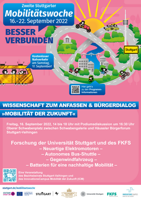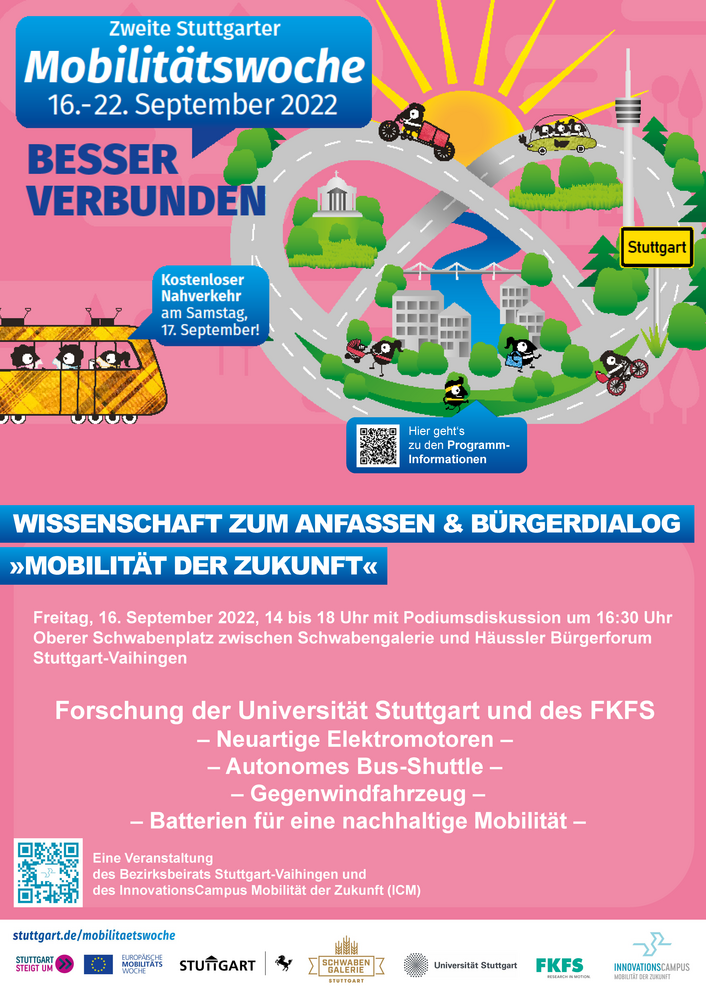 Die Veranstaltung des Bezirksbeirats Stuttgart-Vaihingen und des InnovationsCampus Mobilität der Zukunft (ICM) zur Forschung an der Mobilität der Zukunft und zum Austausch mit Bürger*innen findet zum Start des dreitägigen Stadtteilfests „Vaihinger Herbst“ am 16. September 2022 ab 14 Uhr auf dem Oberen Schwabenplatz an der Schwabengalerie statt.
