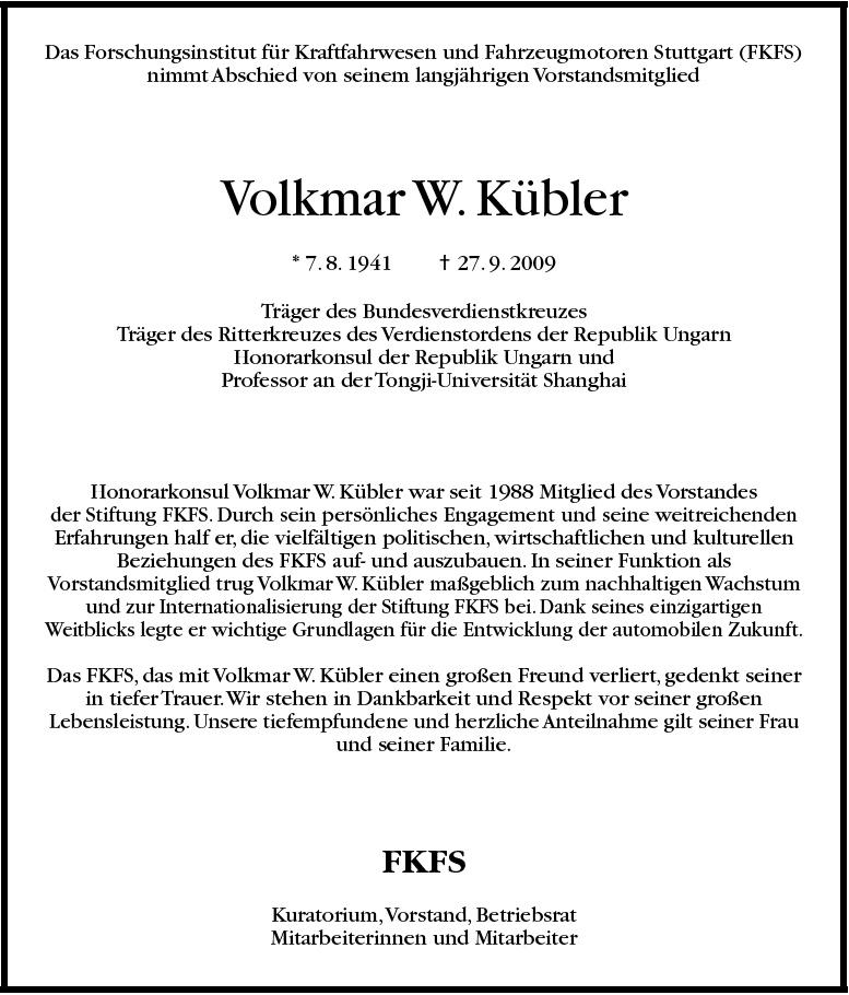 Durch sein persönliches Engagement und seine weitreichenden Erfahrungen und Beziehungen trug er seit seinem Eintritt 1988 in den Vorstand des FKFS entscheidend dazu bei, die internationalen politischen und wirtschaftlichen Beziehungen des Instituts auf- und auszubauen. In seiner Vorstandszeit hat sich die Belegschaft des FKFS vervierfacht und der Umsatz verzehnfachte sich im selben Zeitraum auf heute zirka 16,5 Mio. Euro. In seiner Funktion als Vorstandsmitglied trug Kübler maßgeblich zum nachhaltigen Wachstum bei. Dank seines einzigartigen Weitblicks legte er die Grundlagen für zukünftige Entwicklungen.