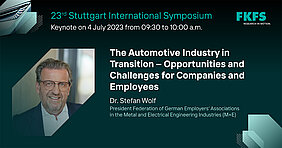 Das 23. Internationale Stuttgarter Symposium rückt immer näher, in nur 4 Wochen ist es soweit! Wir freuen uns Ihnen bereits heute ankündigen zu können, dass Dr. Stefan Wolf, Präsident des Gesamtverbands der Arbeitgeberverbände der Metall- und Elektro-Industrie zum Auftakt am ersten Tag des Symposiums, dem 4. Juli, um 9:30 Uhr eine Keynote halten wird. Das Thema lautet: Die Automobilbranche im Wandel – Chancen und Herausforderungen für Unternehmen und Beschäftigte.