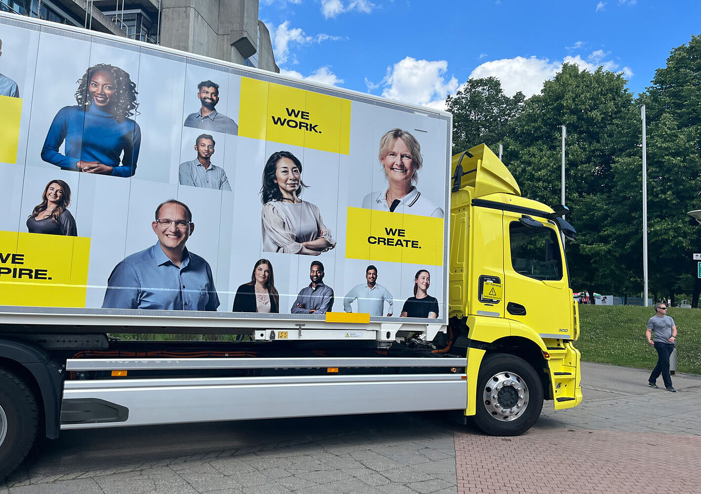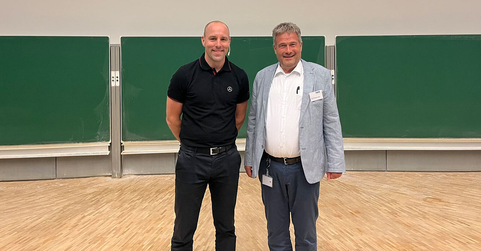 Als Eyecatcher für Besucher brachten die Mitarbeiter*innen der Daimler Truck AG einen E-Actros mit, welcher auf dem Gelände bestaunt werden durfte. Zahlreiche Zuhörer*innen kamen zum Vortrag mit dem Titel: "Leading Sustainable Transportation", welcher krankheitsbedingt leider nicht von Karin Rådström, CEO der Mercedes-Benz Trucks, gehalten werden konnte. Doch glücklicherweise konnte ein toller Ersatz in letzter Sekunde gefunden werden: Herr Michael Scheib, Head of Production Management der Mercedes-Benz Trucks übernahm die Rolle des Referenten und präsentierte uns die Zukunft der Mobilität von E-Trucks und Wasserstoff betriebenen LKW.