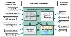 Der Startschuss zu „ASimHP“ (Advanced Simulation of Hybridized Powertrains) fiel im November 2012. In einem ersten Schritt entstanden Komponentenbibliotheken für die Modellierung von Hybridfahrzeugen. Eingesetzt wurden dafür einschlägige Simulationswerkzeuge aus Fahrdynamik, Elektrik/Elektronik, Verbrennungsmotoren und Regelungstechnik. Mithilfe dieser Bibliotheken konnte ein modular aufgebautes Simulationsmodell eines Plug-In-Hybrid Fahrzeugs mit serieller Antriebskonfiguration erstellt werden. Dieser Antrieb wurde gewählt, weil er durch die mechanische Entkoppelung von Verbrennungsmotor und Antriebsrädern für diese Untersuchung besonders geeignet ist und die Vorteile eines rein elektrisch und eines verbrennungsmotorisch betriebenen Fahrzeugs in besonderer Weise vereint.