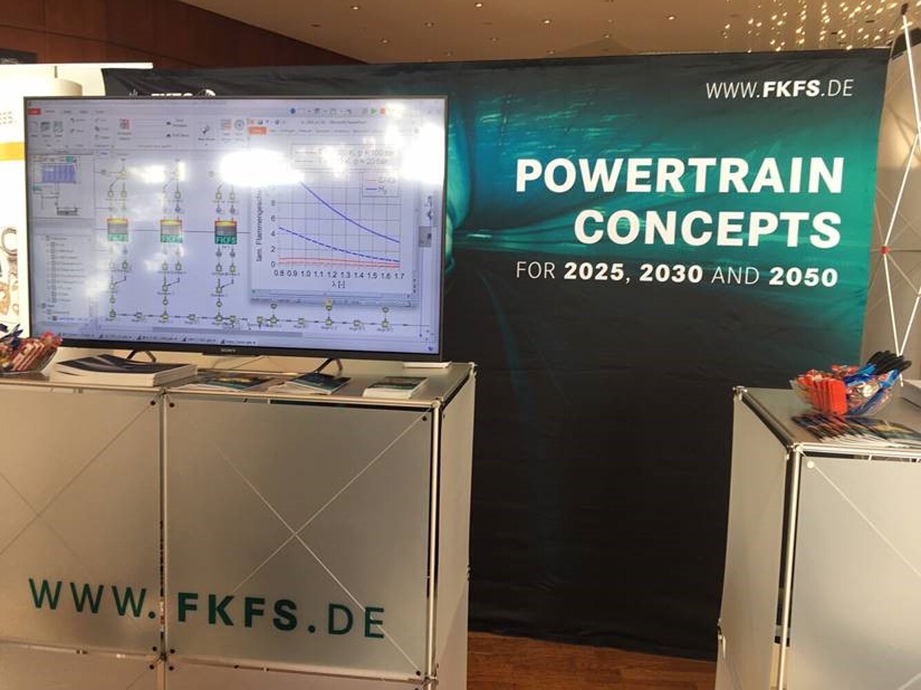 Für Nutzfahrzeuge ist eine Senkung des CO2-Austoßes der verkauften Flotte um 30% bis 2030 durch die EU vorgegeben. Gerade für Heavy-Duty/Langstrecken-Lkw sind in den nächsten 10 Jahren Batterieelektrische- oder Brennstoffzellen-Konzepte noch mit Einschränkungen verbunden. Daher sind dort verbrennungsmotorische Konzepte wie eine magere CNG/LNG-Verbrennung oder eine Wasserstoffverbrennung hochinteressant. Diese Technologien können mit der FKFS-Simulationssoftware UserCylinder® simuliert werden und wurden auf dem FKFS-Messestand präsentiert. Insbesondere für Zulieferer bietet das FKFS einen virtuellen Motorenbaukasten, mit dem sehr einfach die Rückwirkungen zukünftiger Technologien auf einzelne Komponenten bewertet werden können.