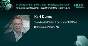 Wir freuen uns, Ihnen als besonderes Highlight die Keynote von Karl Dums, Team Leader Politics and Governmental Affairs der Dr. Ing. h.c. F. Porsche AG, mit dem Titel „eFuels in Patagonia“ ankündigen zu dürfen.