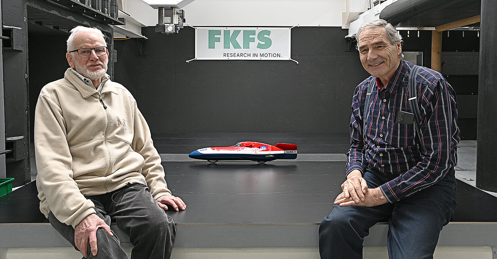 Gestern waren die beiden fahrzeugbegeisterten Freunde Gerhard Bauer und Heinz Herz (rechts im Bild) zu Besuch im Modellwindkanal des FKFS. Sie untersuchen die aerodynamischen Eigenschaften des Rekordmotorrads Baumm IV, das in den Fünfzigerjahren als erstes Zweirad die 320 km/h-Marke knackte. Das Motorrad wurde aufgrund der Liegeposition des Fahrers auch „fliegender Liegestuhl“ genannt. Herz‘ Vater steuerte das Rekordfahrzeug und verunglückte damit 1956. „Die stabile Karosserie des Motorrads hat ihm das Leben gerettet“, erzählt Herz. Doch wieso das Motorrad damals ins Schleudern geriet, ist unklar. Diesem Rätsel möchten Herz und Bauer auf den Grund gehen, denn es gibt viele Theorien zum Unfallgeschehen: War ein Seitenwind, der Untergrund oder doch die Aerodynamik Schuld am Unfall?