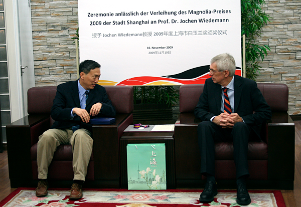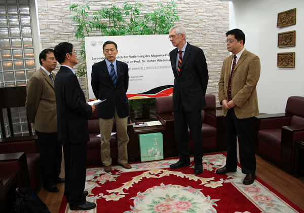 Verbunden mit den herzlichsten Glückwünschen und dem Dank für das herausragende Engagement überreichte Prof. Dr. PEI Gang, Präsident der Tongji-Universität, in Anwesenheit von Prof. Dr. WU Zhihong, Vizepräsident des Chinesisch-Deutschen Hochschulkolleg, Prof. Dr. YU Zhuoping, Direktor des Kolleg für Fahrzeugtechnik der Tongji-Universität und Prof. Dr. YANG Zhigang, Leiter des Shanghai Automotive Wind Tunnel Centers die silberne Medaille an Prof. Dr. Jochen Wiedemann.
