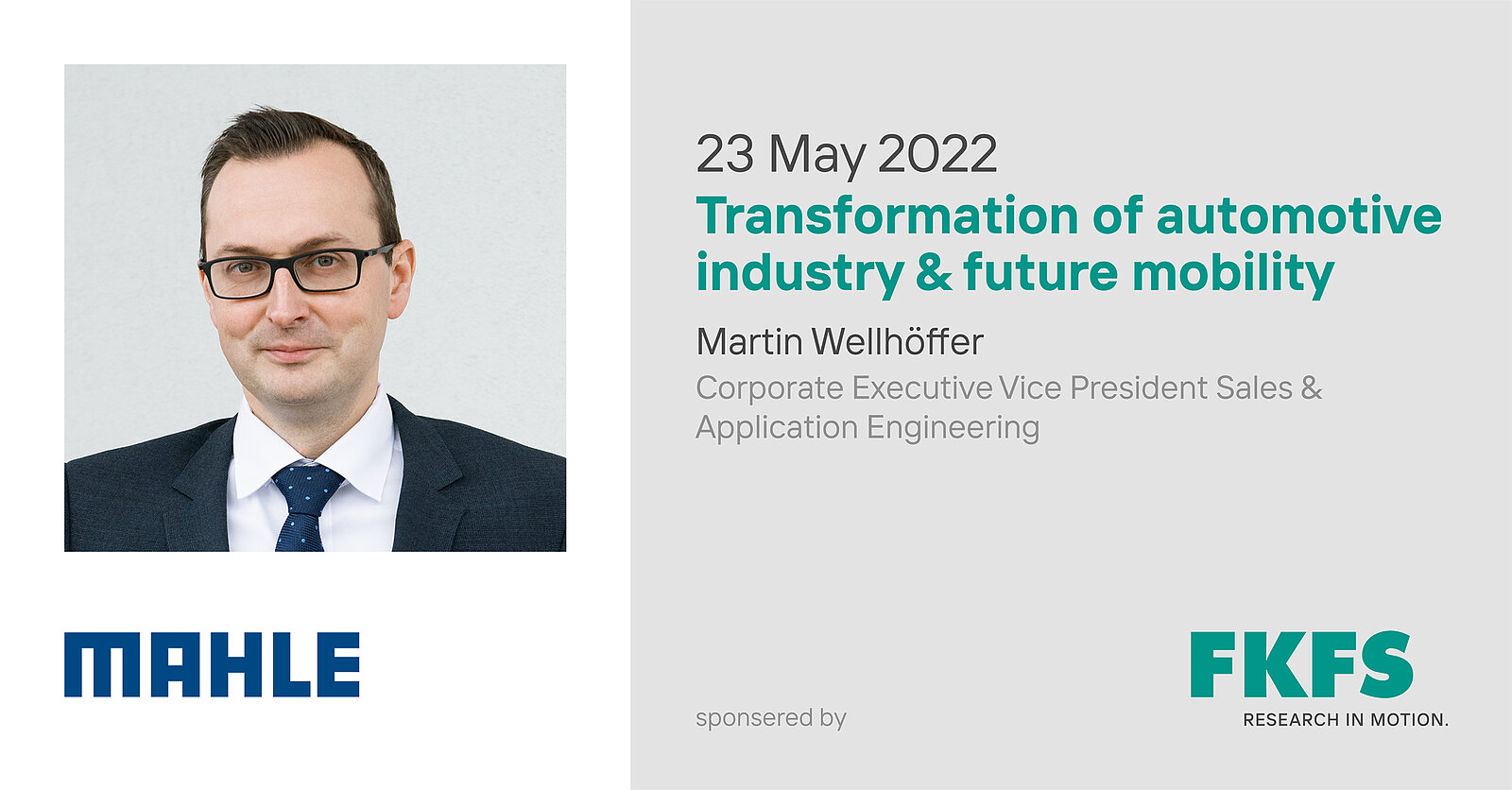 Martin Wellhöffer, Leiter für Automotive-Vertrieb und Anwendungsentwicklung der Mahle GmbH wird einen Vortrag zum Thema „Transformation der Automobilindustrie und der zukünftigen Mobilität“ halten. Veranstaltungsort ist der Hörsaal 47.02, Pfaffenwaldring 47 „Richard Feldtkeller“ in Stuttgart-Vaihingen.