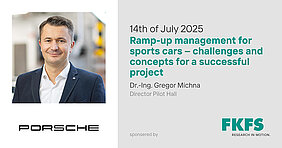Am Montag, den 14. Juli findet der letzte Vortrag des Technologieführers im Sommer 2025 statt. Dr.-Ing. Gregor Michna, Director Pilot Hall der Dr. Ing. h.c. F. Porsche AG ist zu Gast. Er spricht über das Thema „Ramp-up management for sports cars – challenges and concepts for a successful project”.