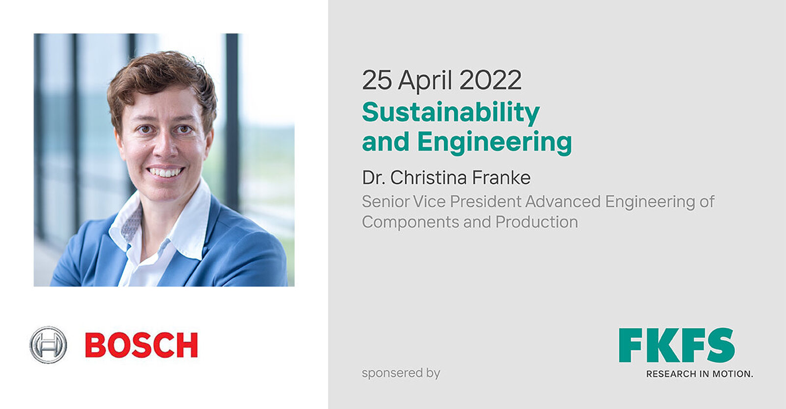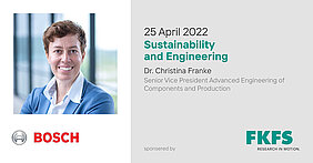 Die vom FKFS gesponserte Vortragsreihe "Technologieführer der Automobilbranche stellen sich vor" startet in die nächste Runde und findet endlich wieder in Präsenz statt. Den Auftakt mach die Robert Bosch GmbH mit einem Vortrag von Dr. Christina Franke, Bereichsleiterin Advanced Engineering of Components an Production. Das Thema des Vortrags wird "Nachhaltigkeit und Engineering" sein.