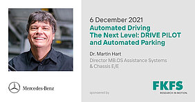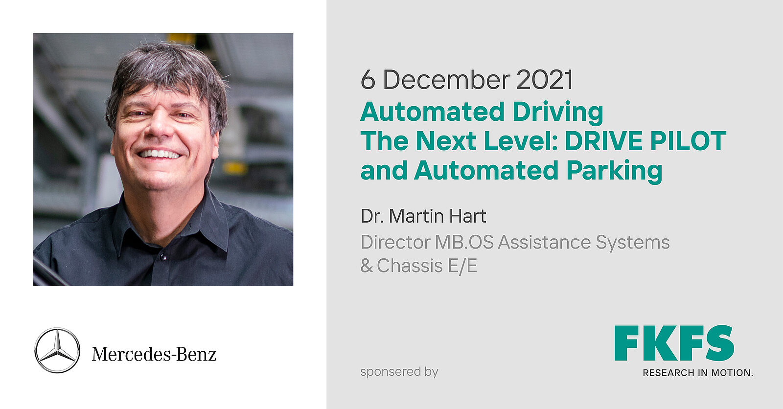 Die nächste digitale Veranstaltung der „Technologieführer der Automobilindustrie stellen sich vor“ findet kommenden Montag, 6. Dezember um 18 Uhr statt. Herr Dr. Martin Hart, Director MB OS Assistance Systems & Chassis E/E – Mercedes-Benz wird einen Vortrag zum Thema Automated Driving – The Next Level: DRIVE PILOT and Automated Parking halten. Es wird also wieder spannend!