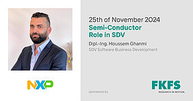 Nächste Woche, am 25. November, ist NXP zu Gast bei der Veranstaltungsreihe „Technologieführer der Automobilindustrie stellen sich vor“. Houssem Ghanmi, SDV Software Business Development, lädt zu seinem Vortrag „Semi-Conductor Role in SDV“ ein. Anschließend können sich die Teilnehmenden bei einem kleinen Imbiss mit den Vertreter*innen von NXP und dem Vortragenden austauschen.