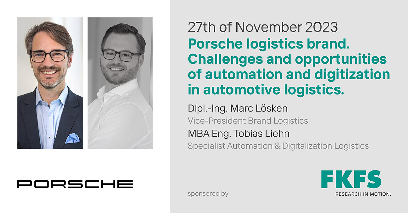 Kommenden Montag, den 27. November, findet der letzte Vortrag der Technologieführer-Veranstaltungsreihe für dieses Jahr statt. Marc Lösken, Leiter Markenlogistik, und Tobias Liehn, Fachreferent Automatisierung & Digitalisierung Logistik, von Porsche sind zu Gast. Wir freuen uns bereits auf ihren Vortrag „Die Porsche Markenlogistik. Herausforderungen und Chancen in der Automatisierung und Digitalisierung der Automobillogistik.“
