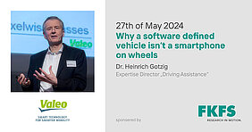 Valeo ist nächste Woche zum ersten Mal Teil der Veranstaltungsreihe „Technologieführer der Automobilindustrie stellen sich vor“. Dr. Heinrich Gotzig, Expertise Director „Driving Assistance“ lädt zu seinem Vortrag „Warum ein Software-Defined Vehicle kein Smartphone auf Rädern ist“ ein. Wir sind gespannt, welche Erkenntnisse wir über SDVs aus seinem Vortrag gewinnen können.