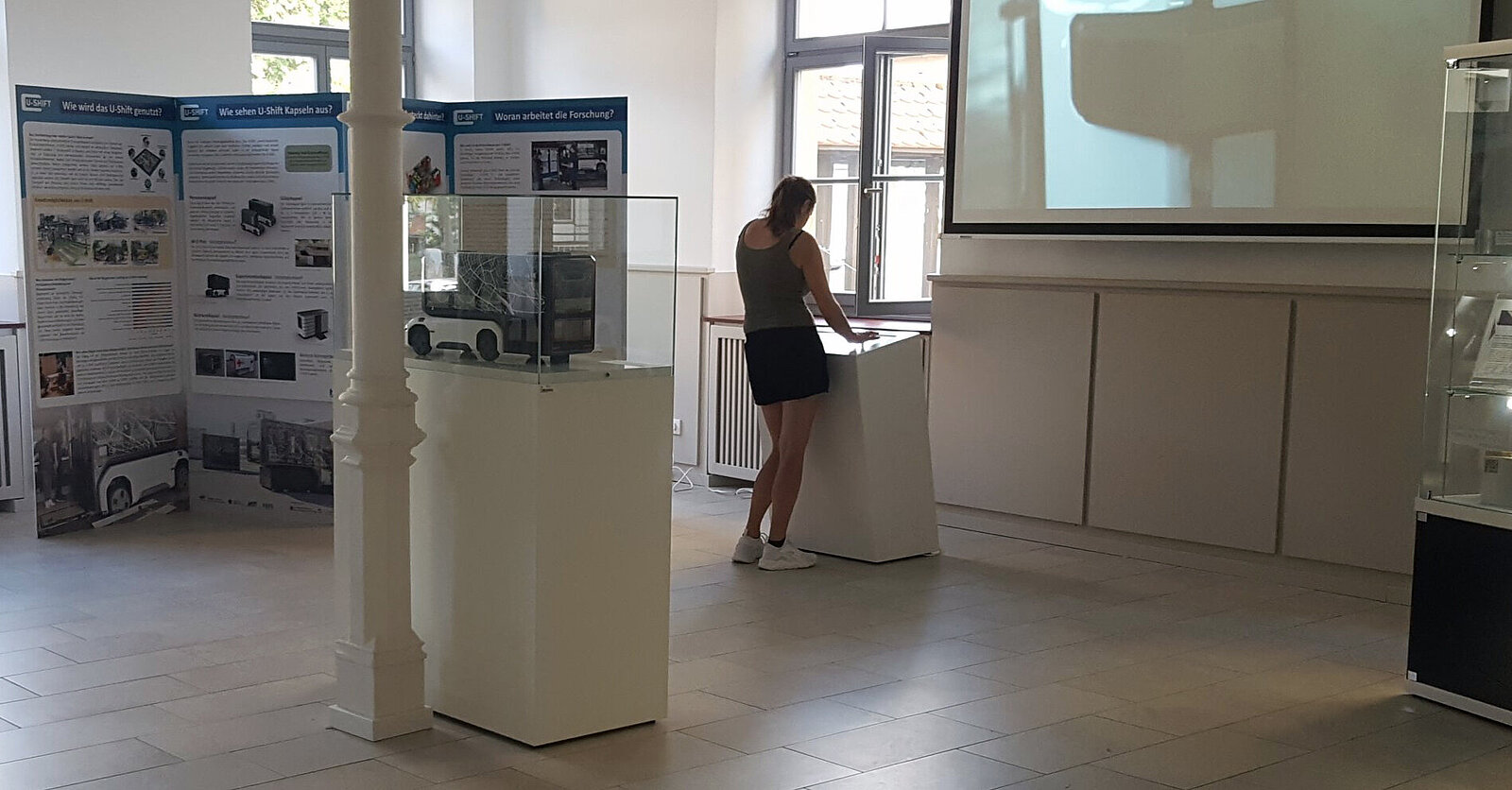 Ob als On-demand-Bus, Transporter oder Verkaufsstand – das futuristischen Fahrzeug U-Shift ist flexibel und vielseitig nutzbar. Eine Ausstellung auf der Landesgartenschau in Eppingen vom 27.07.2022 bis zum 07.08.2022 bietet viele Informationen rund um das U-Shift, von möglichen Anwendungsfällen bis hin zu technischen Aspekten. Mit Texten, Filmen und Objekten erläutern die Projektpartner, das Deutsche Zentrum für Luft- und Raumfahrt e.V. (DLR), das Forschungsinstitut für Kraftfahrwesen und Fahrzeugmotoren Stuttgart - FKFS, das Karlsruher Institut für Technologie und die Universität Ulm das U-Shift Konzept und zeigen, woran gerade geforscht wird. Gefördert wird das Projekt vom für Wirtschaft, Arbeit und Wohnungsbau Baden-Württemberg.