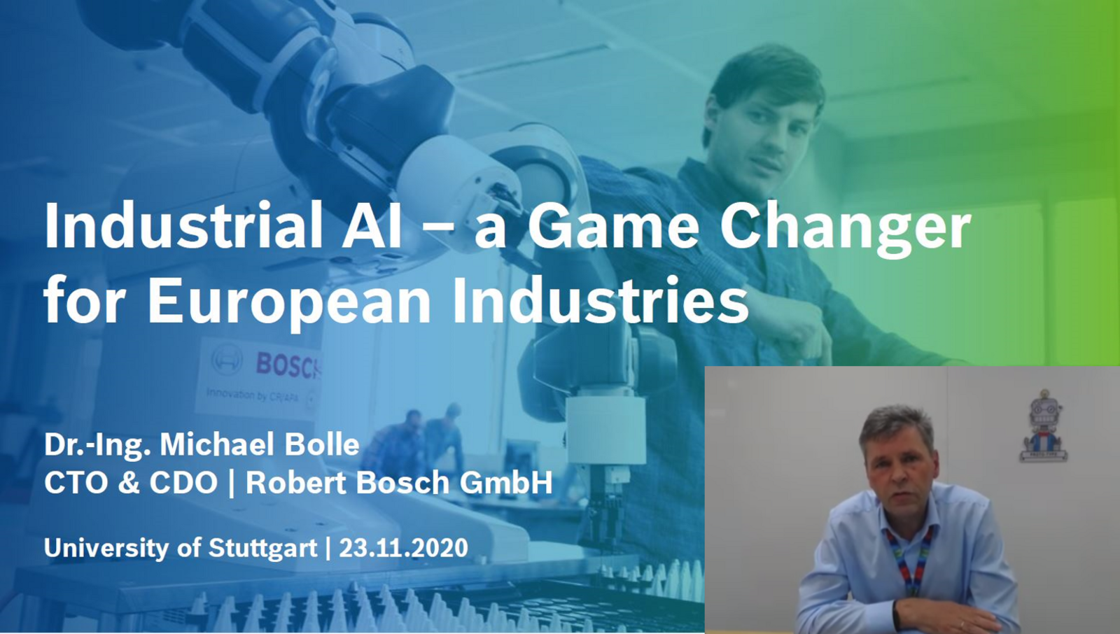 Am Montagabend waren über 150 Teilnehmer beim Vortrag der Robert Bosch GmbH virtuell dabei. Geschäftsführer Dr. -Ing. Michael Bolle sprach zum Thema "Industrial Al - A game changer for European Industries". Er sprach über künstliche Intelligenz und ihre Anwendung in technischen Produkten. Dabei gab er viele praktische Beispiele und hielt ein leidenschaftliches Plädoyer für einen hybriden Ansatz, bei dem datengetriebene und physikalische Modelle miteinander kombiniert werden.